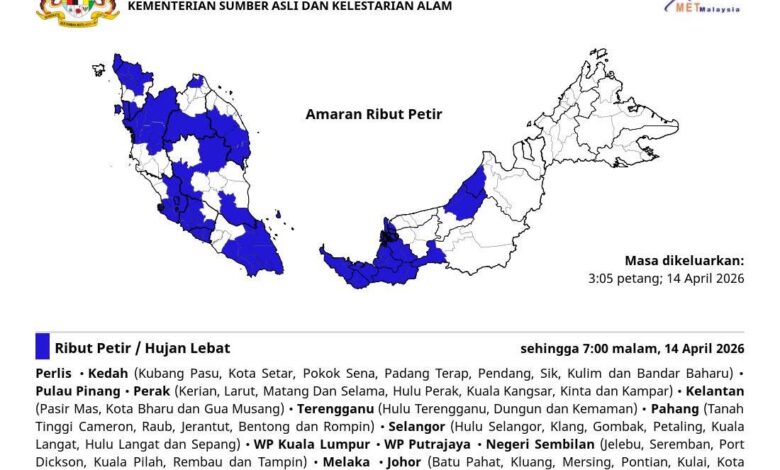 Menurut MetMalaysia, keadaan cuaca tersebut dijangka melibatkan ribut petir, hujan lebat serta angin kencang dalam tempoh berkenaan.