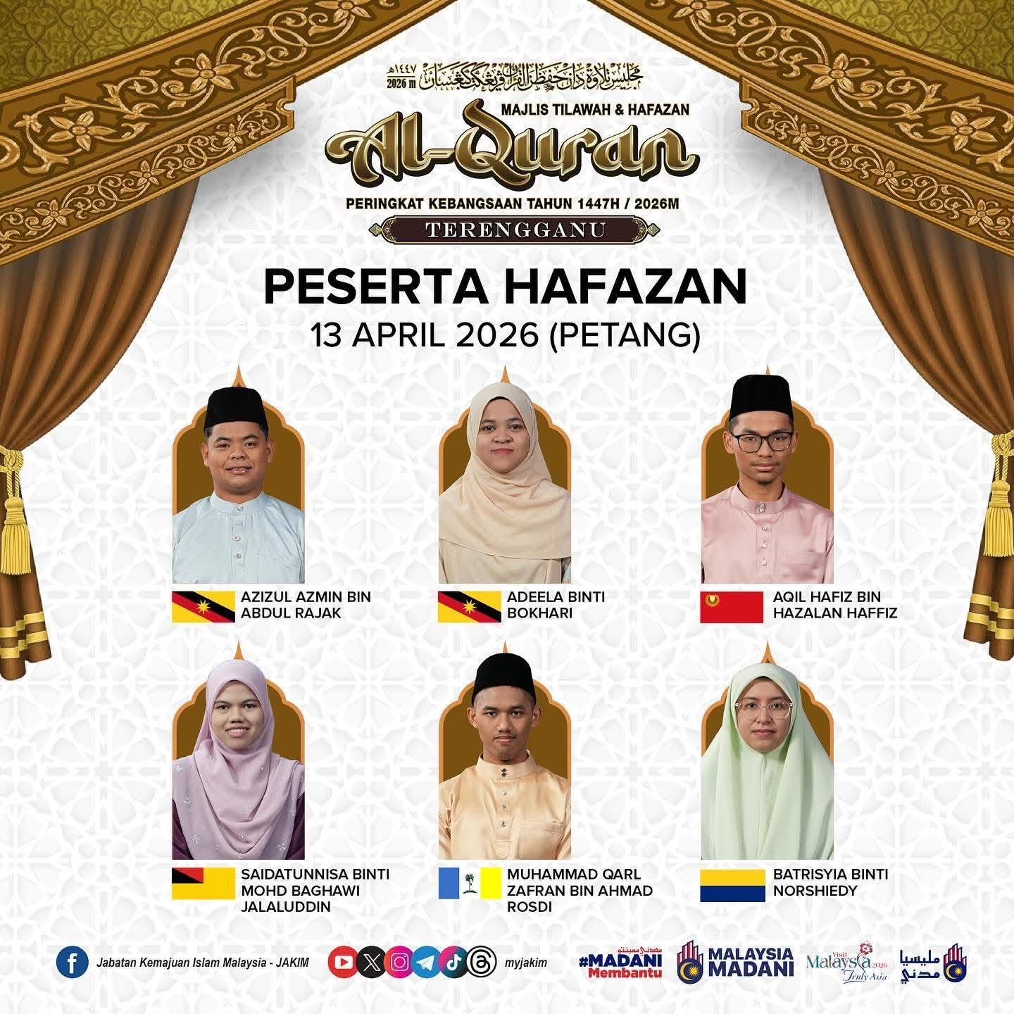 Dalam pada itu, orang ramai boleh mengikuti majlis berprestij tersebut secara siaran langsung menerusi saluran TV AlHijrah serta platform media sosial rasmi Jabatan Kemajuan Islam Malaysia (JAKIM).