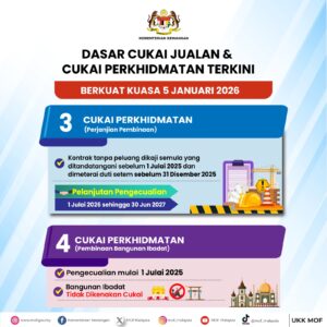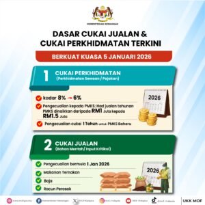Berkuat kuasa 5 Januari 2026, kerajaan menambah baik pelaksanaan Cukai Jualan dan Cukai Perkhidmatan (SST) bagi menyokong pertumbuhan ekonomi serta meringankan beban rakyat dan perniagaan.